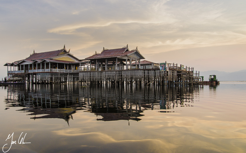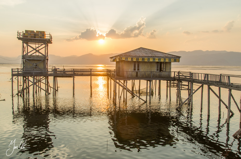 Lake Inle in Burma is quite a touristic place with accommodation from $15 and up. We stayed at the very beautiful Little Inn in Nyaungshwe which has garden bungalows with own bathrooms. Very romantic, clean and breakfast included. You can rent bicycles and go on boat trips for tourist attractions and also see the fisherman. We did first the rather disappointing Inle Lake tourist boat trip which is a bit commercial. The next day though I decided on  a Sunrise Boat Trip which was very beautiful and a unique experience. The Inle Lake fisherman were posing for the photos and I was very happy to get my shot.  The bars in this little Town are welcoming to hang out at night and have a beer with all the hikers arriving every day.